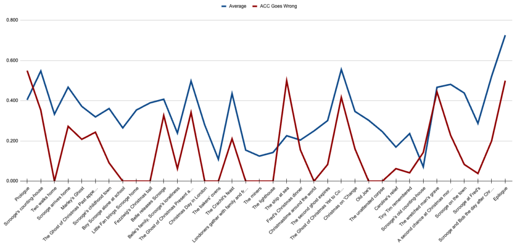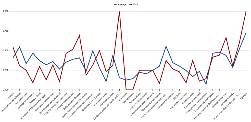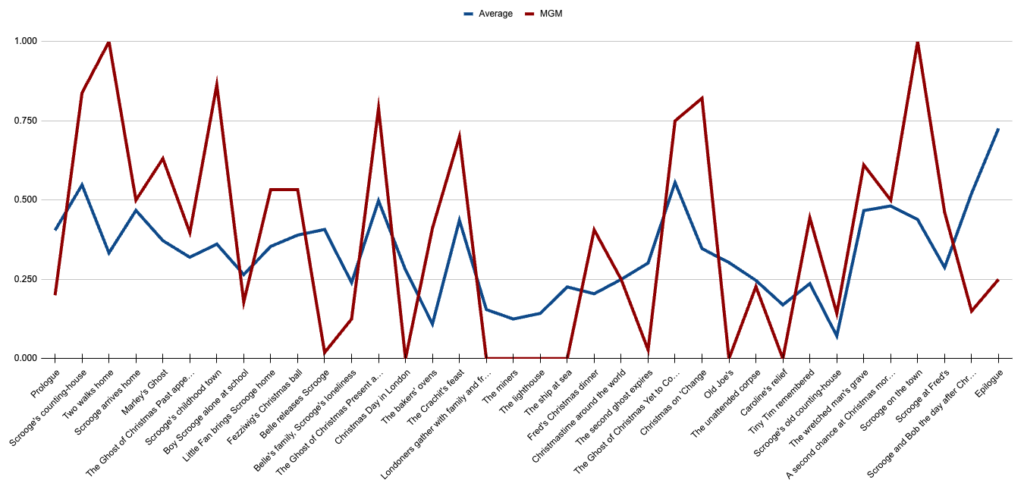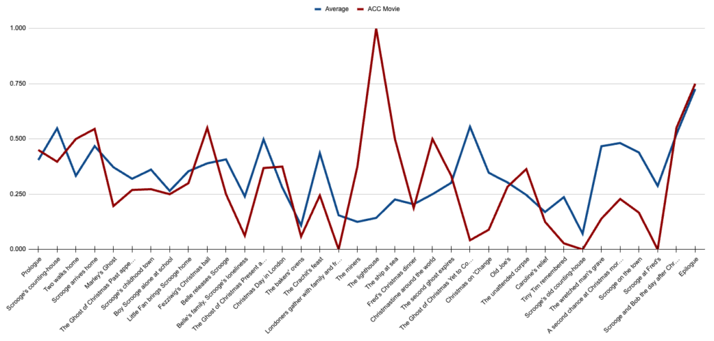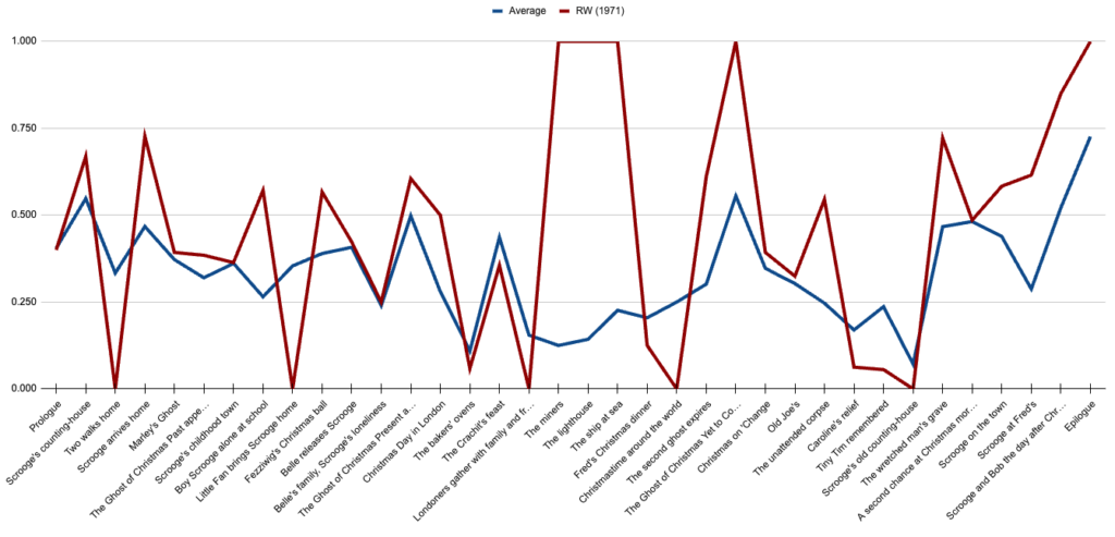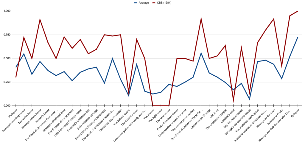 But there must be a way to be quantitatively specific when evaluating film adaptations of a book, right? I want to give people a decent idea of how, over the past century, popular film adaptations of Dickens’ novella compare to the source material. And we’re doing this by the book.