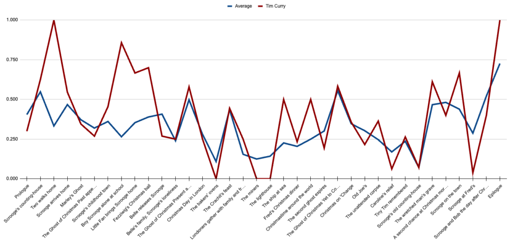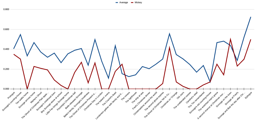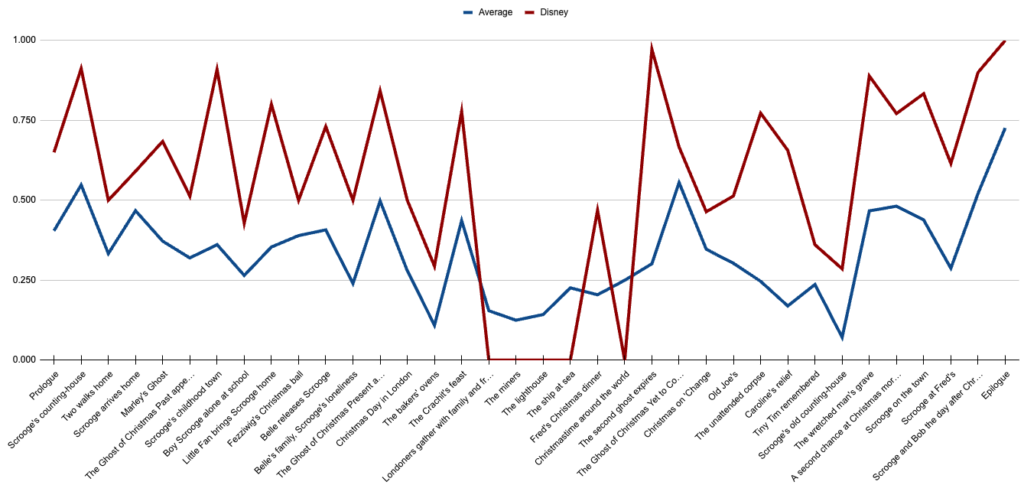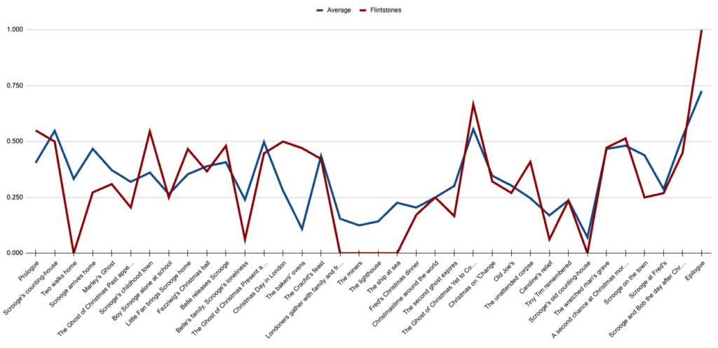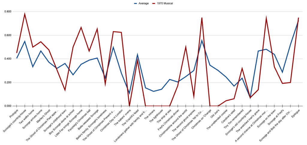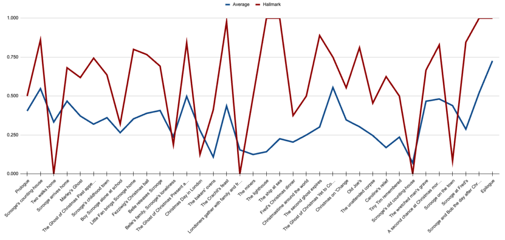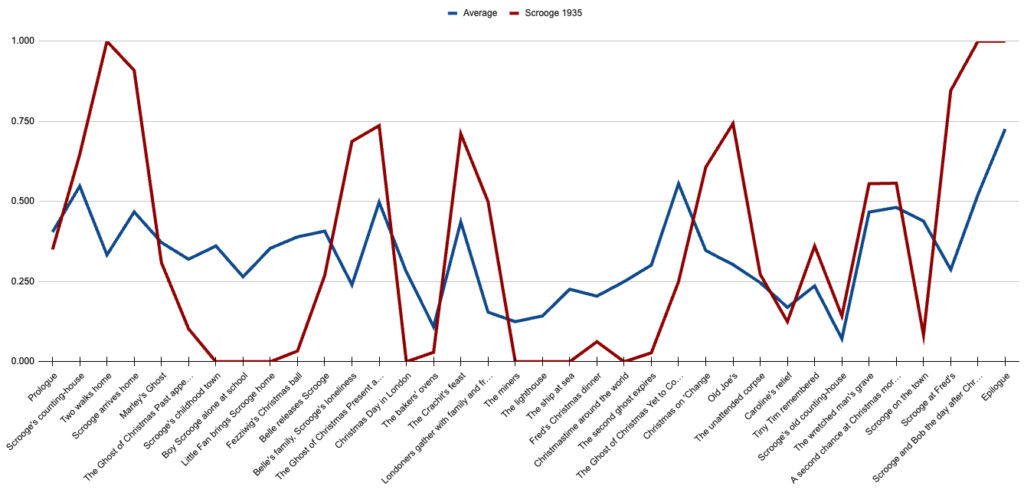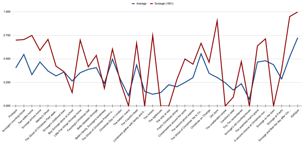 No film should be held to the standard of 100%—that would probably be a terrible film. (We don’t really need to interrupt Scrooge’s afternoon with a tailor getting fined for disorderly conduct the previous Monday, right?) So instead, I think it’s good for us to start with an idea of how the “average” film in this batch includes each paragraph by scene. This is the line we’ll be comparing every other film to: